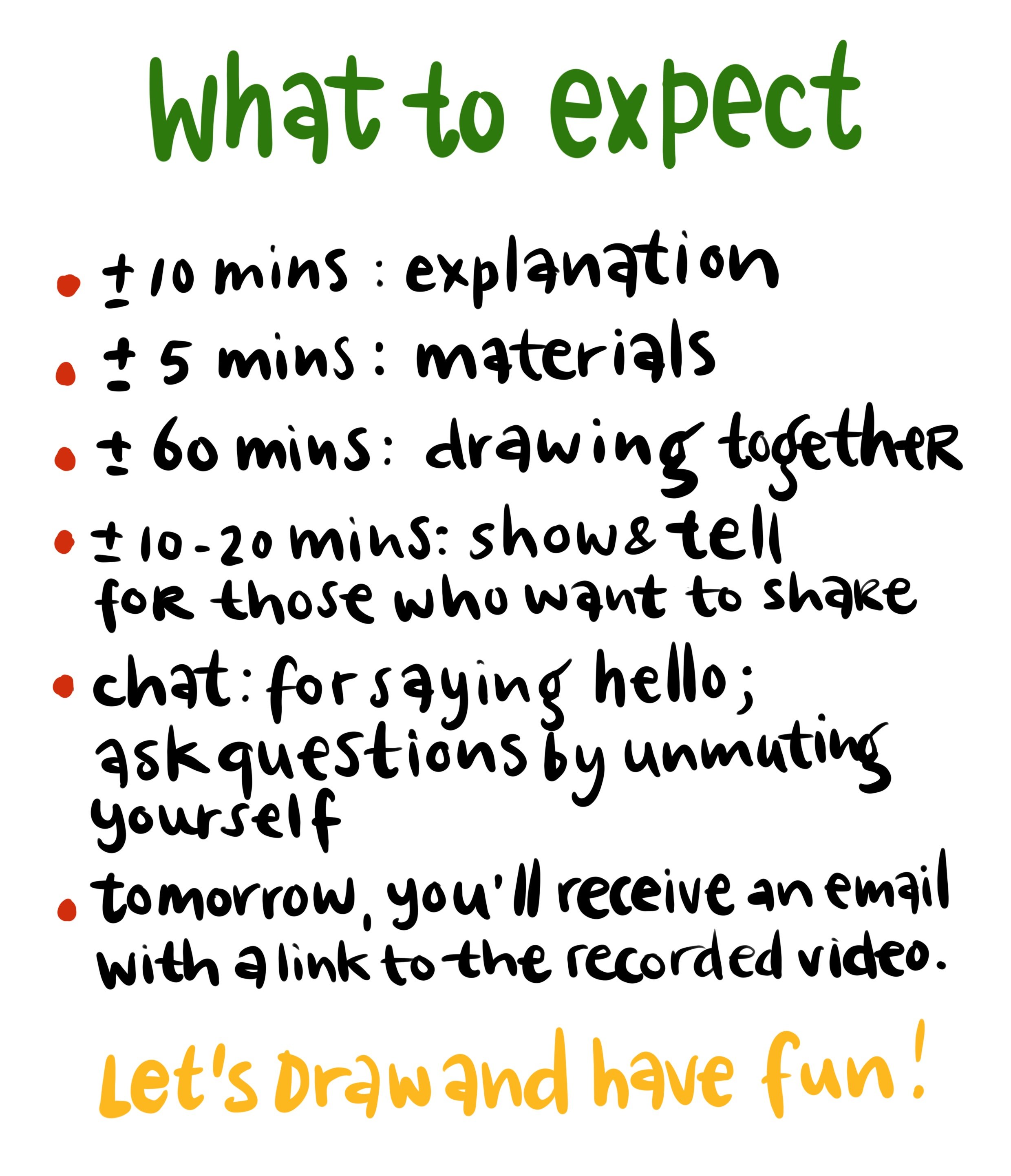 We'll spend 90 minutes drawing and getting creative together. I'll give you instructions and an assignment, and we'll wrap up with a "show & tell" where you can share your work, ask questions, and get inspired by what everyone made. Sharing is totally optional though; no pressure!